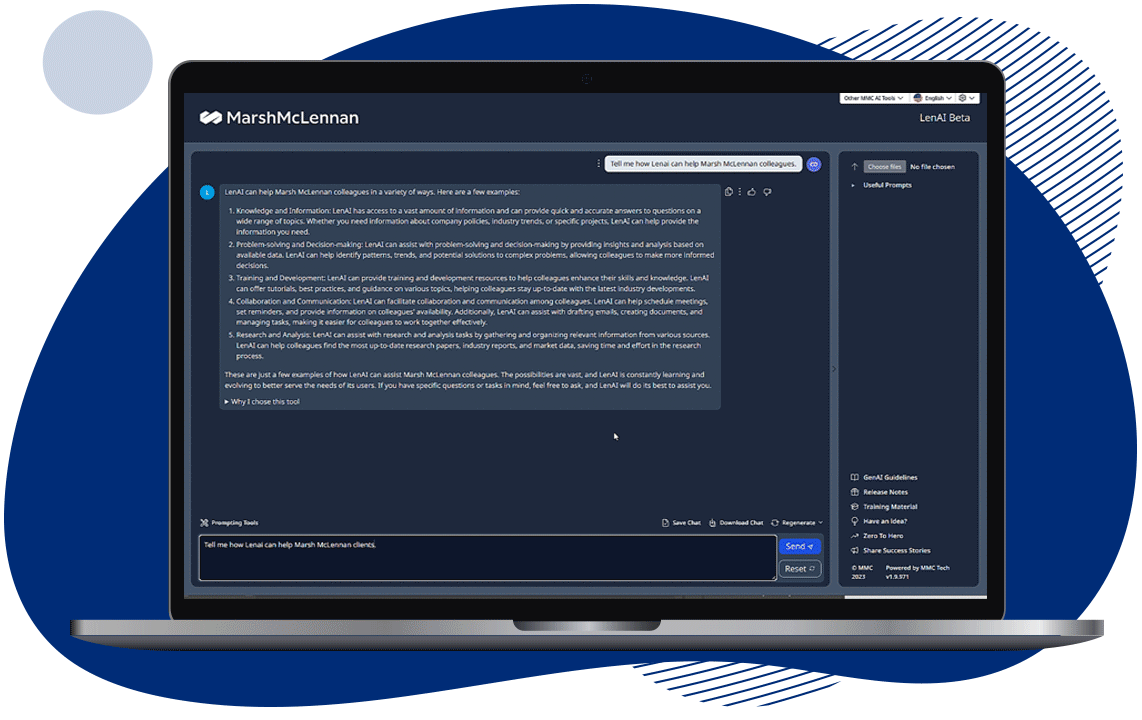 Generative AI brings both challenges and opportunities for businesses. It has the power to boost productivity, enhance decision-making, improve client experiences and transform business models. However, it also comes with risks that need careful management to ensure security and compliance. At Marsh McLennan, we are leading the way in responsible AI adoption, building powerful AI tools to support how our colleagues work and using that experience to advise clients on how to harness AI's potential to drive innovation, mitigate risks and achieve growth.