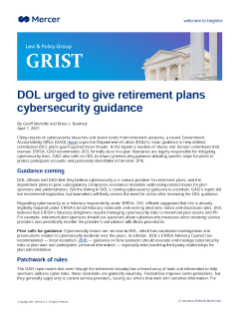 Citing reports of cybersecurity breaches and stolen funds from retirement accounts, a recent Government Accountability Office (GAO) report urges the Department of Labor (DOL) to issue guidance to help defined contribution (DC) plans guard against these threats. In the report to leaders of House and Senate committees that oversee ERISA, GAO recommends DOL formally state that plan fiduciaries are legally responsible for mitigating cybersecurity risks. GAO also calls on DOL to issue cybersecurity guidance detailing specific steps for plans to protect participant accounts and personally identifiable information (PII).