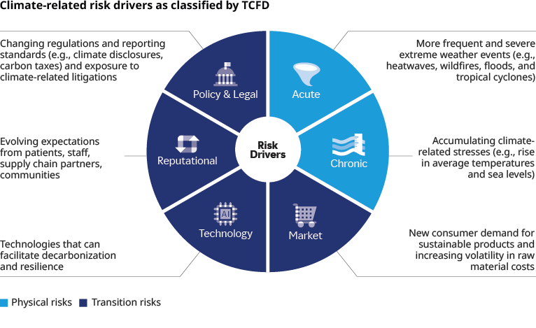Physical risks are already evident to healthcare providers: climate-related shocks and stresses are straining care delivery, damaging healthcare facilities, fracturing supply chains, and increasing disease burden. Decarbonization efforts are also gathering pace, leading to both transition risks – such as new sources of liability – and to opportunities like green capital and insurance, energy and cost efficiencies, talent retention, and improved trust and reputation.