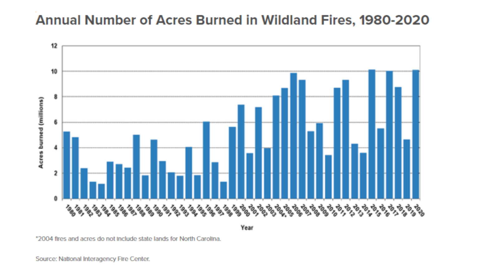The world is getting hotter and drier, making the incidence of wildfires more frequent. According to the Insurance Information Institute, the annual number of acres burned in wildland fires has more than doubled in the last two decades.