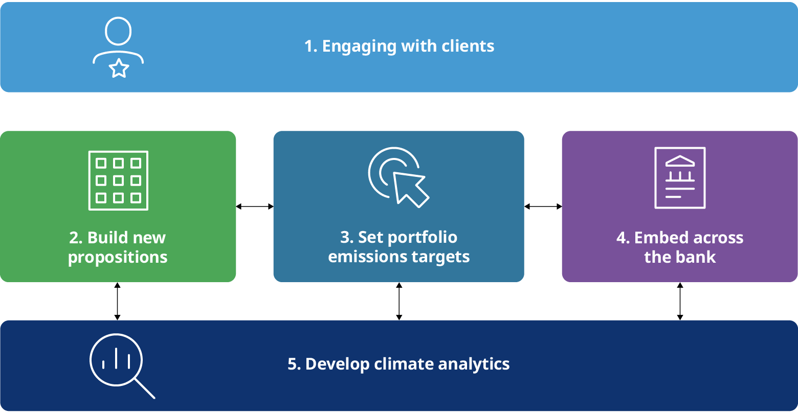 - Engage with clients. The most important role banks can play is partnering with their clients to help drive change. Delivering across the corporate franchise will require new capabilities, systematic campaigns, and broad training of existing teams.