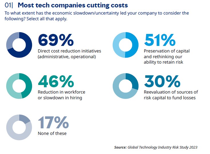 And highly publicized layoffs are persevering this year as tech companies take steps to cut costs. The majority — 69% — of respondents to Marsh’s Global Technology Industry Risk Study 2023 said they are implementing direct cost reduction initiatives while close to half are reducing their workforce or slowing down hiring (see Figure 1).
