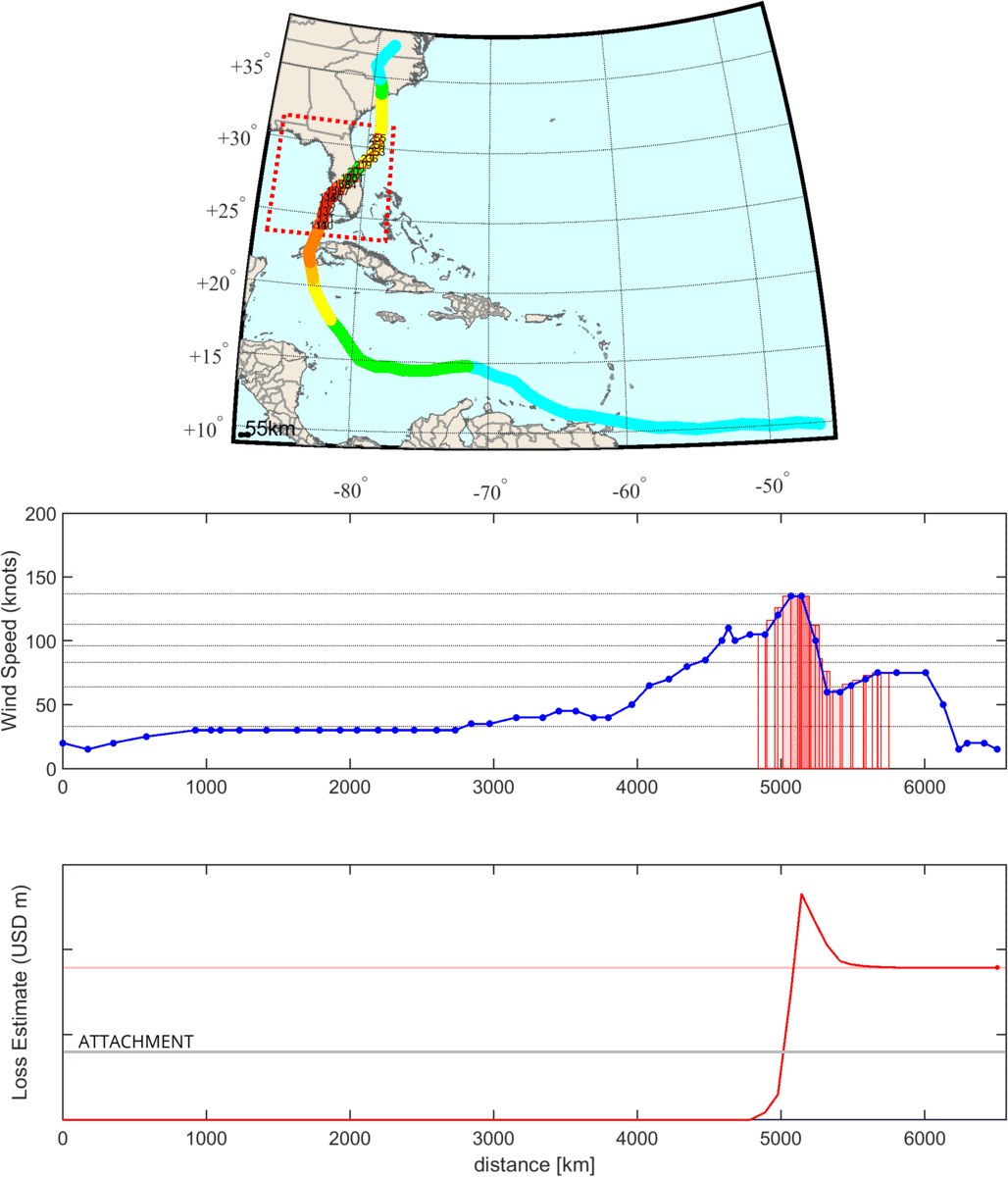 Top: Track progression map for historical event Ian (2022) with color proportional to reported sustained wind speed; Center: Maximum wind speed along track with GC StormGrid cells shown in red. Shades are proportional to the quality of each cell’s loss model; Bottom: Loss computed according to the combination of the individual cell estimates. Final estimate exceeds the attachment level of the parametric structure, shown as horizontal gray line, and would have triggered a payout.