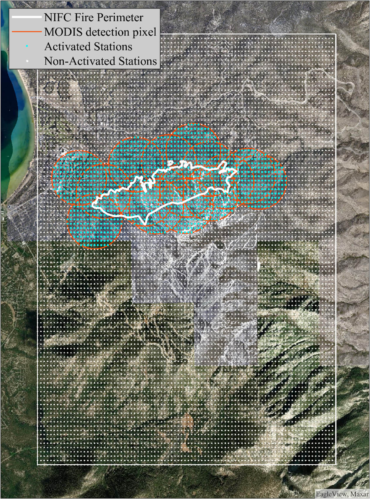 The coverage area (shown as a white rectangle) near South Tahoe, California was discretized into a regular grid of virtual stations (shown as points). During the Gondola Fire (2002) FIRMS reported fifteen fire observations (footprints outlined in red). The fire observations activated any virtual station within these footprints (shown in blue).