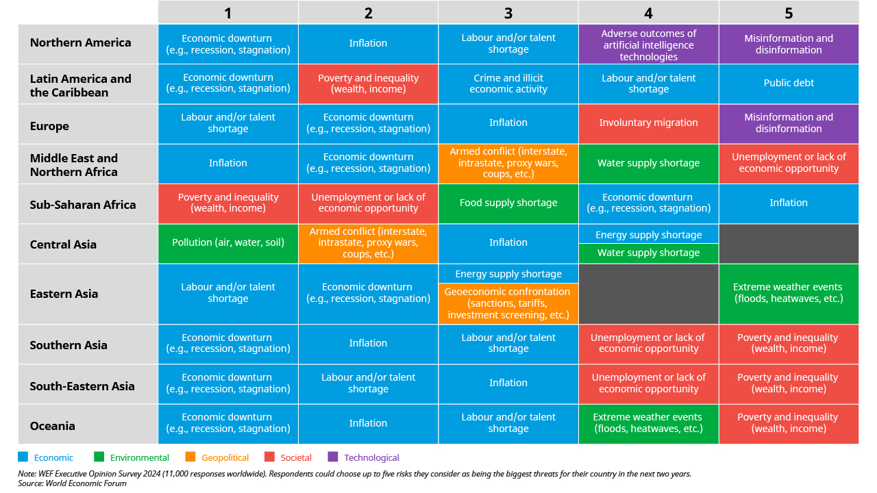 Record levels of inflation, a pervasive cost-of-living crisis, energy supply challenges, and the extreme weather events that devastated communities in many countries drove a relatively consistent set of top business leader concerns across regions. Similar to 2023, the strength of sentiment on these issues resulted in a lower profile for geopolitical and technological risks.