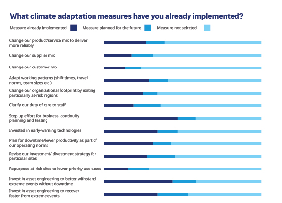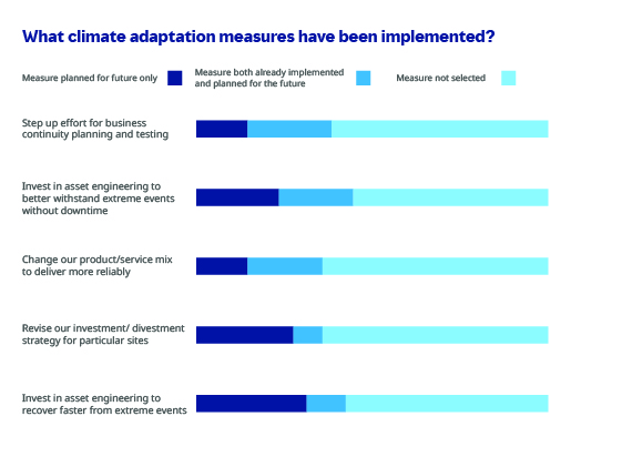 The survey reveals that corporates have started taking action in response to the growing physical risks. Three of the largest areas of focus are business continuity planning and testing (49%), investing in asset engineering to better withstand extreme events without downtime (41%) and adapting working patterns (33%).