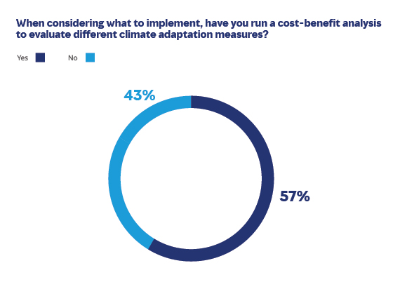 At the heart of every business is a clear understanding of costs vs. benefits – and this method is vital in determining the business case for climate adaptation. Some 57% of business leaders reported using cost-benefit analyses to demonstrate the business case for adaptation and determine the appropriate strategy.