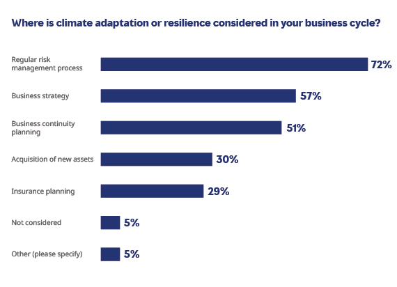 There appears to be a growing recognition that cost of risk optimization require integration of insurance and adaptation strategies:  37% of those who responded to our survey said they are speaking to insurers, and 30% reported speaking to brokers about adaptation. 29% confirmed they are thinking about climate change adaptation and resilience as part of their insurance planning cycle.