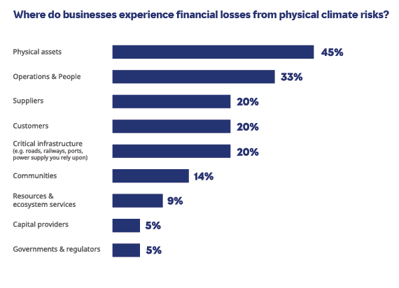 The survey also confirms that for organizations, climate hazards pose a threat well beyond physical assets. Participants experienced impacts on their operations and people (33% of respondents); supply chains (20%); customers (20%); critical infrastructure (20%) and local communities (14%).
